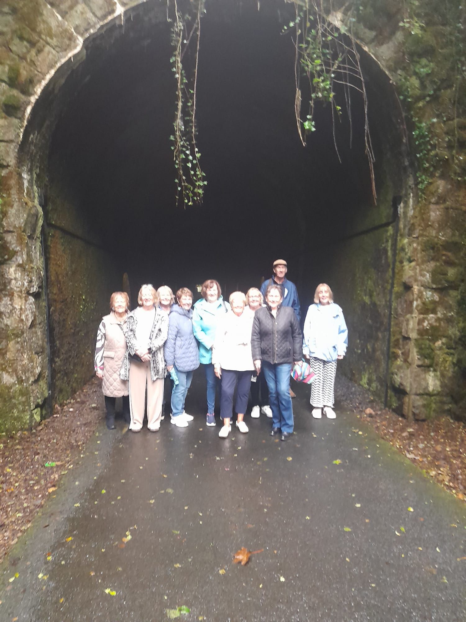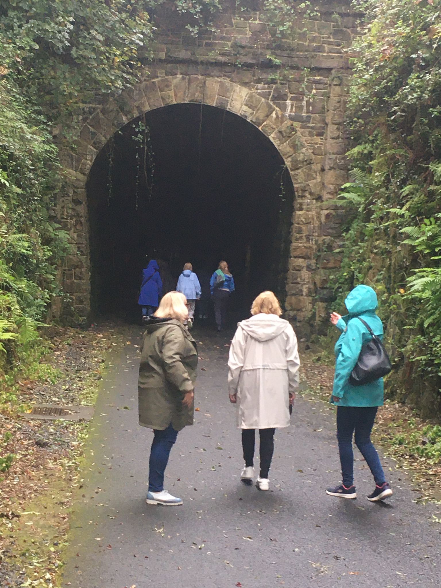 On a dull, drizzly September morning, we had the Greenway more or less to ourselves. First stop was the Signal Box cafe which gave us a warm start to explore the Kilmacthomas viaduct with it views over the town and the famous Flahavan factory. We then headed for what was possibly the highlight of the day, a complete pass through the Ballyvoyle tunnel, 400m long. The seas were by this time quite rough and from inside the minibus we marvelled at the sweep of Clonea Bay. Lunch was conducted at the Railway Cottage, again on the Greenway, where we also met the few cyclist out that day.